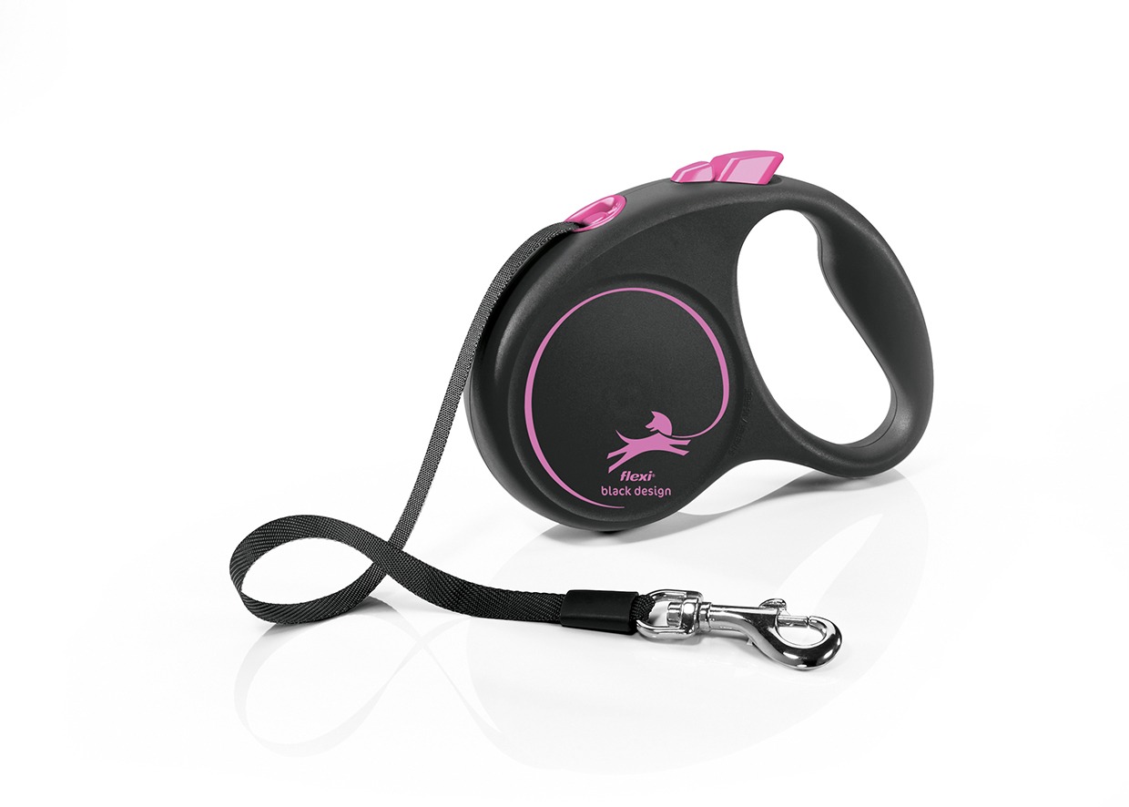 The flexi BLACK DESIGN comes in three bold colors that form a striking contrast with the black housing, as well as a subtle all-black leash set off by a classic silver logo.